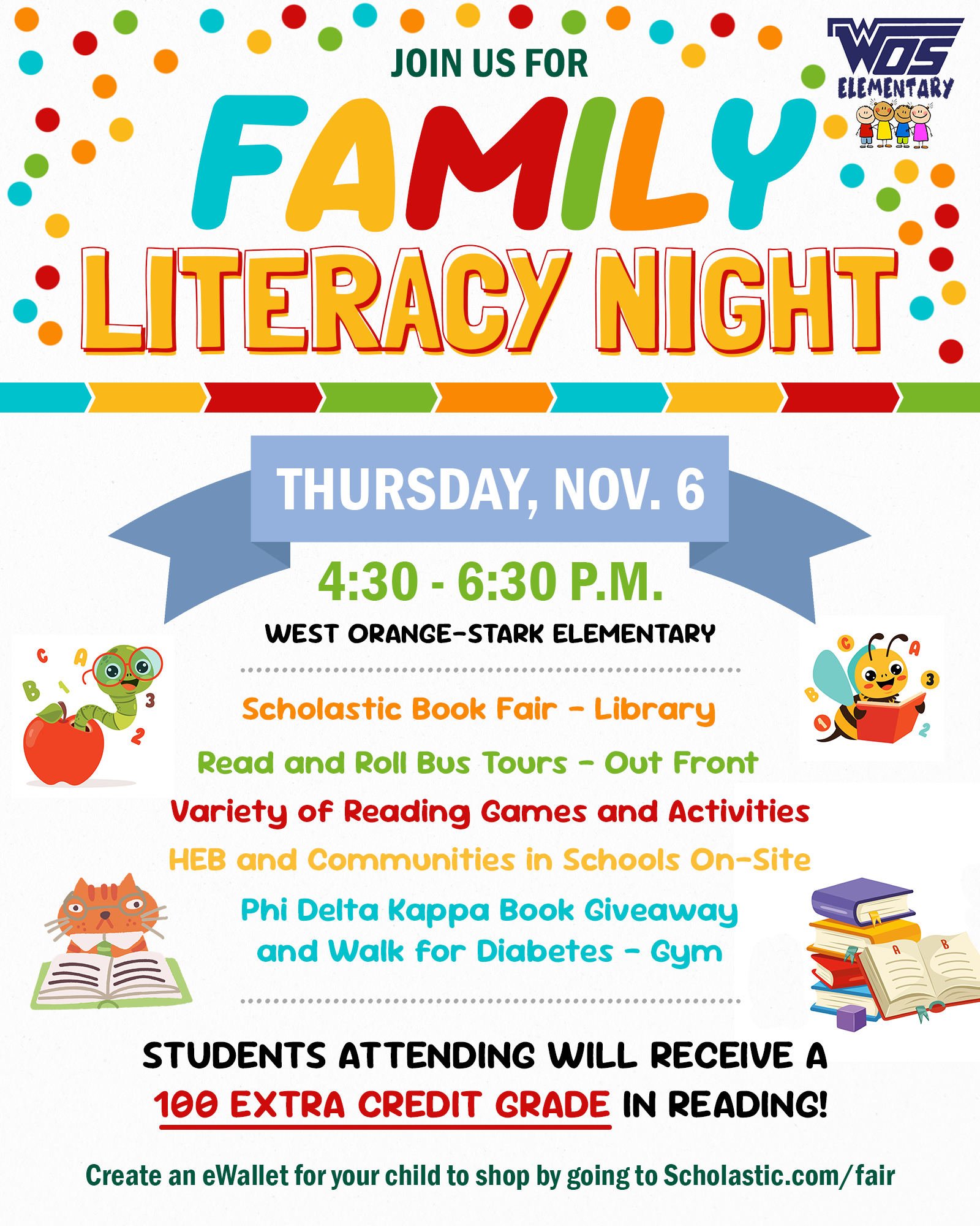 Tomorrow night is Family Literacy Night for West Orange-Stark Elementary, and there will be plenty of engaging reading activities! Shop around the Scholastic Book Fair, take a tour on the Read and Roll bus, engage with local community organizations, join in a book giveaway, and much more!